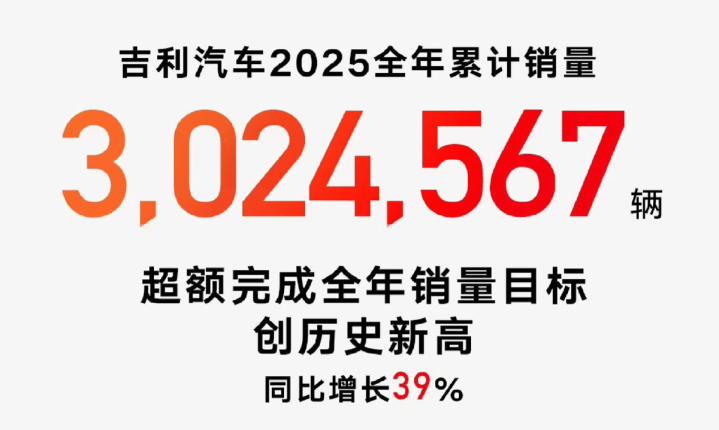 吉利汽车整车业务在2025年,取得了巨大的成绩,全年销量302万台,相比于2024年的217万销量,涨幅达到了39%。