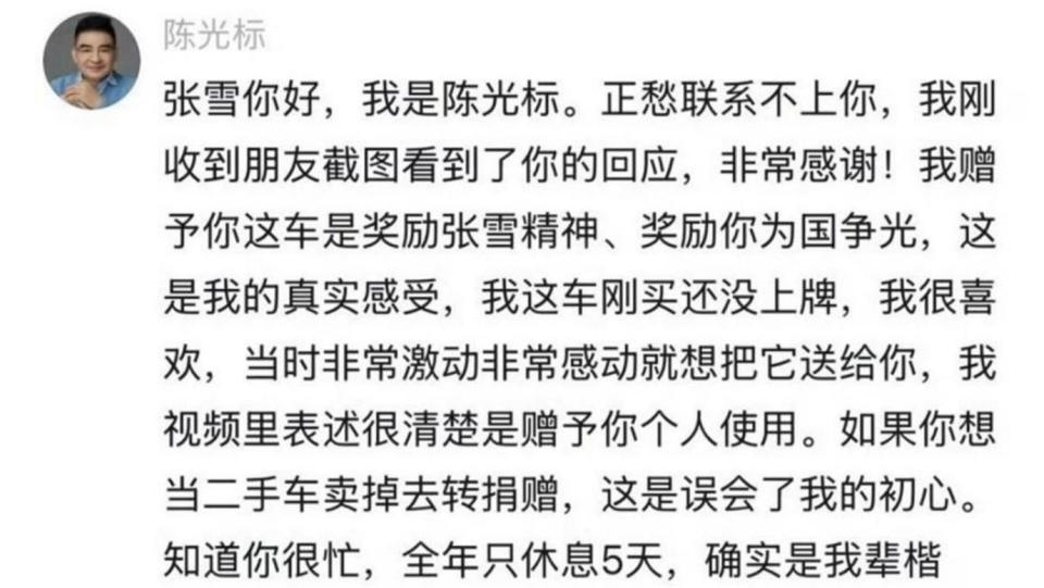 真正的僵局出现在“见面”这个环节。 陈光标的意思很明确:车我要当面送,你得来提车,我们握个手、合个影,这事才算圆满。 张雪的反应更明确:我不来。 他有空接受采访,有空见师父和朋友,但就是对“当面提车”没兴趣。 一个非要演完这场高光戏码,一个连剧本都懒得翻开。