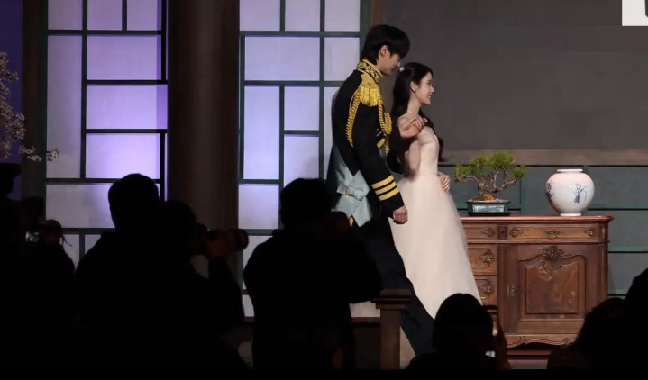 两人从舞台一侧缓缓走来,边佑锡因为剧中扮演的王子的角色,所以直接穿着王子装就来了,他很绅士的握着IU的手,两人一起上台。